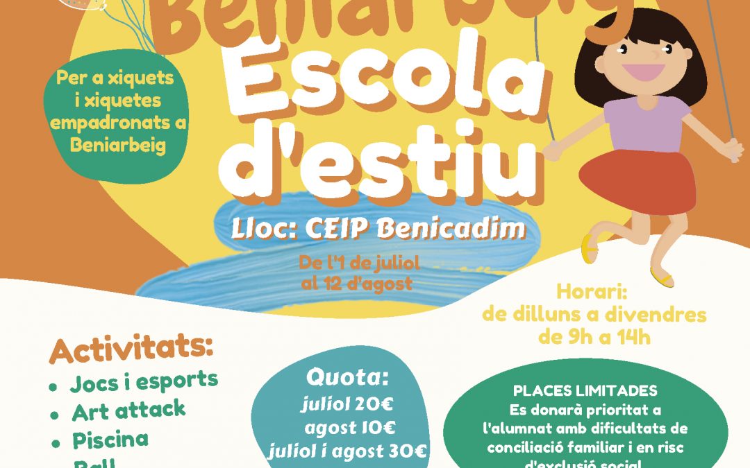 Un any més, la Regidoria d’Educació organitza l’Escola d’Estiu perquè els xiquets de Beniarbeig disposie d’activitats durant el mes de juliol i la primera quinzena d’agost. L’horari és de 9:00 ha 14:00 h de dilluns a divendres i poden participar els nascuts entre el 2010 i el 2018. Les inscripcions poden fer-se mitjançant aquest enllaç: https://com-a-casa.es/escola-destiu-beniarbeig