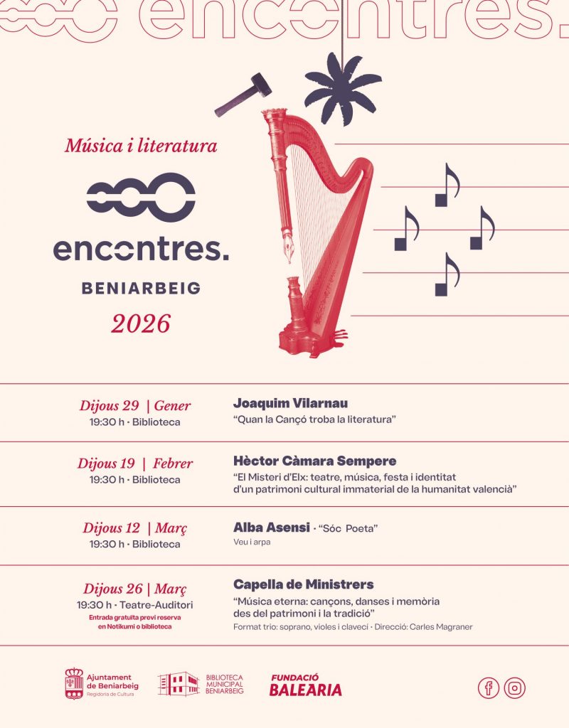Beniarbeig tornarà a convertir-se en un referent cultural de la Marina Alta en estos primers mesos de 2026 amb la celebració de la dotzena edició dels Encontres a Beniarbeig, una cita ja consolidada que enguany gira entorn del vincle entre la música i la literatura.