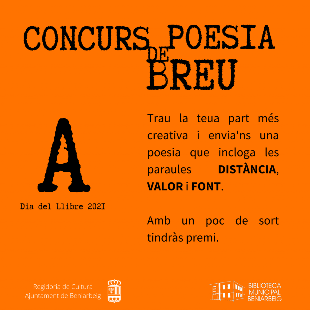 També s’ha creat el Concurs de Poesia Breu, l’objectiu del qual segons Sara Gil Peretó, com a regidora de cultura, és “intentar traure la part creativa que tots tenim i d’una manera fàcil i divertida jugar amb les paraules”. El concurs està pensat per a que es puga participar d’una manera fàcil des del telèfon mòbil, pel que s’ha creat un formulari amb el que es poden enviar de manera anònima tots els textos, els quals poden ser en valencià o castellà i hauran de tindre una extensió màxima de 350 caràcters. El termini de presentació s’ha establert fins el dijous 22 d’abril a les 14:00. Serà el 23 d’abril quan s’anunciarà l’obra guanyadora, la qual serà premiada amb un lot de llibres en valor de 60€. A més, entre tots els participants es sortejarà un val de 30€ en llibres. Ací es poden consultar les bases del concurs. Bases Concurs Poesia – Beniarbeig 2021