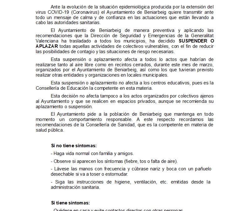 A causa de l’estat d’alarma i seguint les limitacions del Reial Decret 463/2020 del 14 de març per l’alerta sanitària del COVID-19 s’ha emès un Decret d’Alcaldia pel qual queda tancada l’atenció presencial dels serveis administratius de l’Ajuntament de Beniarbeig. Durant aquests dies i fins a nou avís, la forma que tindrà la ciutadania per a relacionar-se amb l’administració local serà per via telefònica (96 576 60 18), correu electrònic (info@beniarbeig.org) o a través de la seu electrònica https://beniarbeig.sedelectronica.es