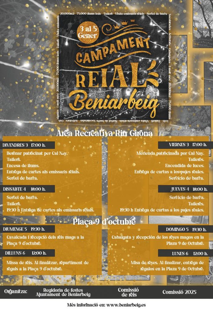 Divendres a les 17:00h s’inaugurarà el campament amb un berenar patrocinat per Ca’l Nay, per a continuació iniciar els tallers de manualitats infantils. Amb l’arribada del capvespre es procedirà a l’encesa de la il·luminació, i a més, per tal que tots els xiquets puguen fer entrega de les seues cartes, durant la vesprada estaran presents els emissaris reials i la Comissió de Festes oferirà servei de barra amb refrescs, dolços i xocolate. A l’endemà, serà a partir de les 18:00h quan s’inicien de nou els tallers, la il·luminació i el servei de barra, mentre que l’arribada dels patges reials visitaran primer a les 17:30h el C.C. Portal de la Marina, per a seguidament a les 19:30h tornar a estar presents a Beniarbeig.