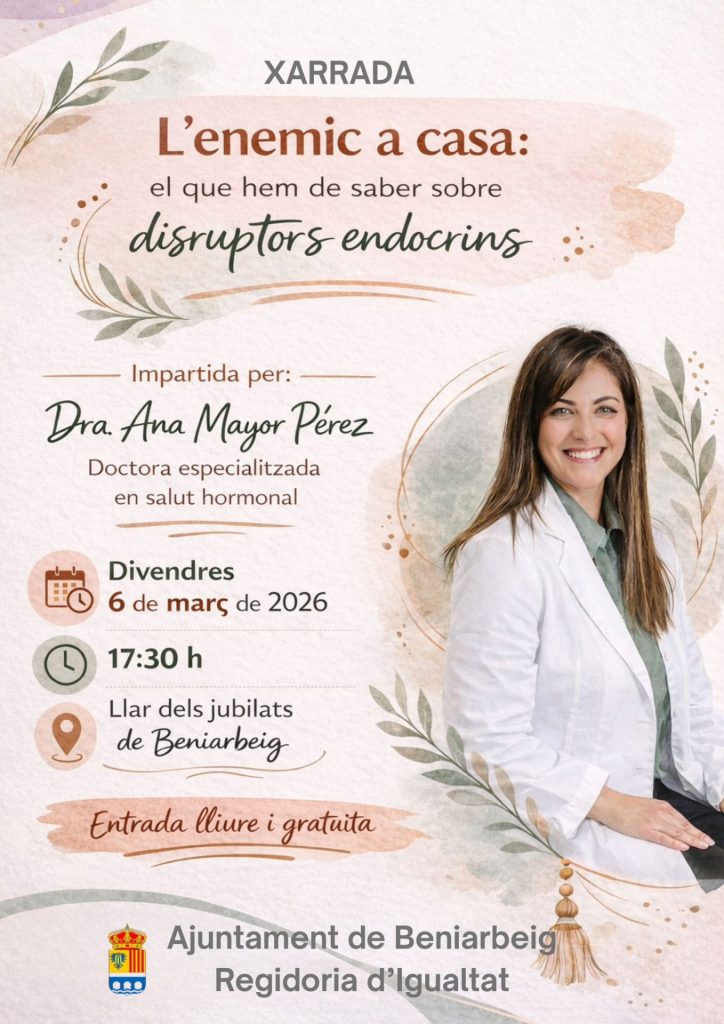 Amb motiu del Dia Internacional de la Dona, la Regidoria d’Igualtat que encapçala Sara Gil Peretó ha preparat un programa començarà el divendres 6 de març amb una xarrada sobre disruptors endocrins, on s’abordarà com determinats factors ambientals poden afectar la salut, amb especial atenció a la salut femenina. Serà a càrrec de la Dra. Ana Mayor Pérez i tindrà lloc a les 17:30h en el saló d’actes de la llar de jubilats.