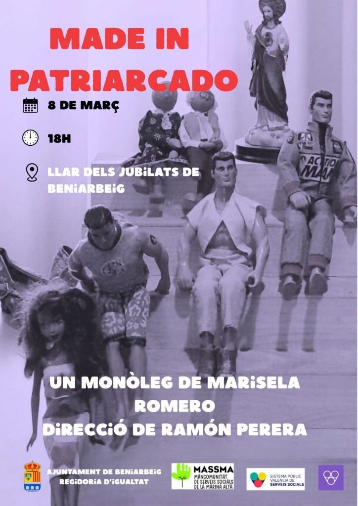 A continuació, el diumenge 8 de març, a les 18:00h serà el torn de “Made in Patriarcado”, un monòleg sobre el patriarcat, que des d’una mirada crítica i amb to proper convidarà a pensar sobre les desigualtats encara presents. L’obra té a Marisela Romero en la part d’interpretació i a Ramón Perera a la direcció, comptant també amb el suport de la MASSMA. A més, durant la setmana, la Biblioteca Municipal de Beniarbeig posarà a disposició dels usuaris, una selecció de 10 llibres, on ja siga per autoria o contingut, posen en relleu la diversitat de les dones en la literatura.