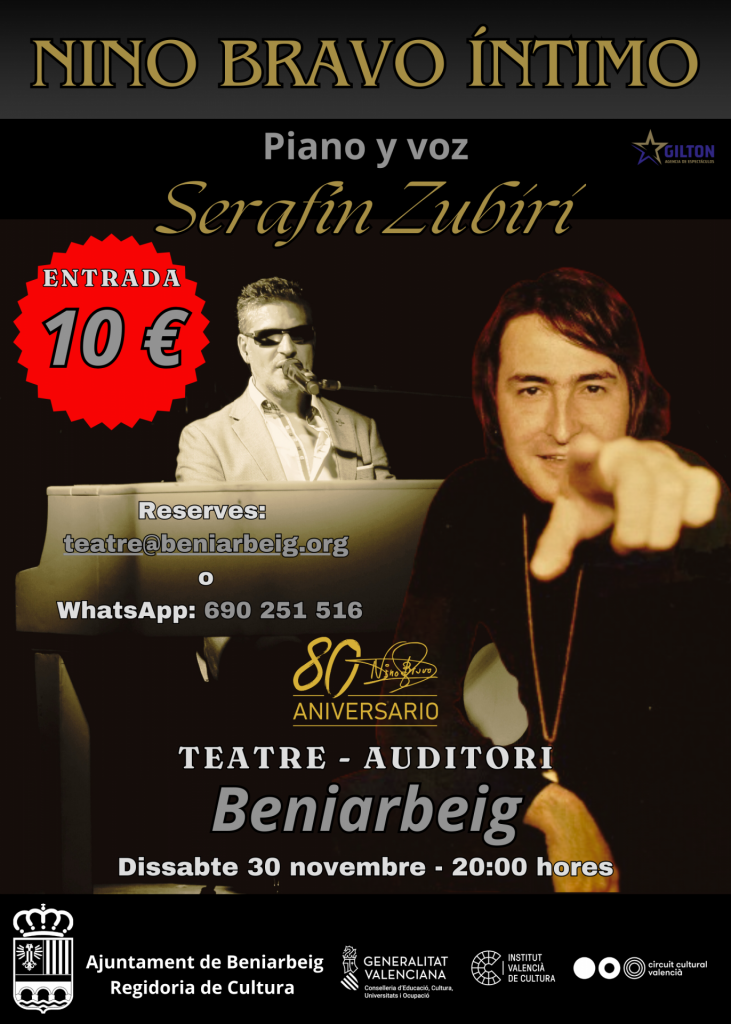 Amb l’espectacle Nino Bravo Íntimo que tindrà lloc aquest dissabte 30 de novembre al Teatre-Auditori de Beniarbeig, Zubiri commemora el 80 aniversari del naixement de Nino Bravo (Aielo de Malferti, 1944 – Villarubio, Cuenca, 1973) amb un concert que repassa les cançons més emblemàtiques del cantant valencià. Un recorregut a través dels seus cinc discs, que amb la veu i les mans al piano de Zubiri, recreen una atmosfera intimista per gaudir de cançons com «Te quiero, te quiero», «Noelia», «Un beso y una flor», «Cartas amarillas» o «Mi tierra».